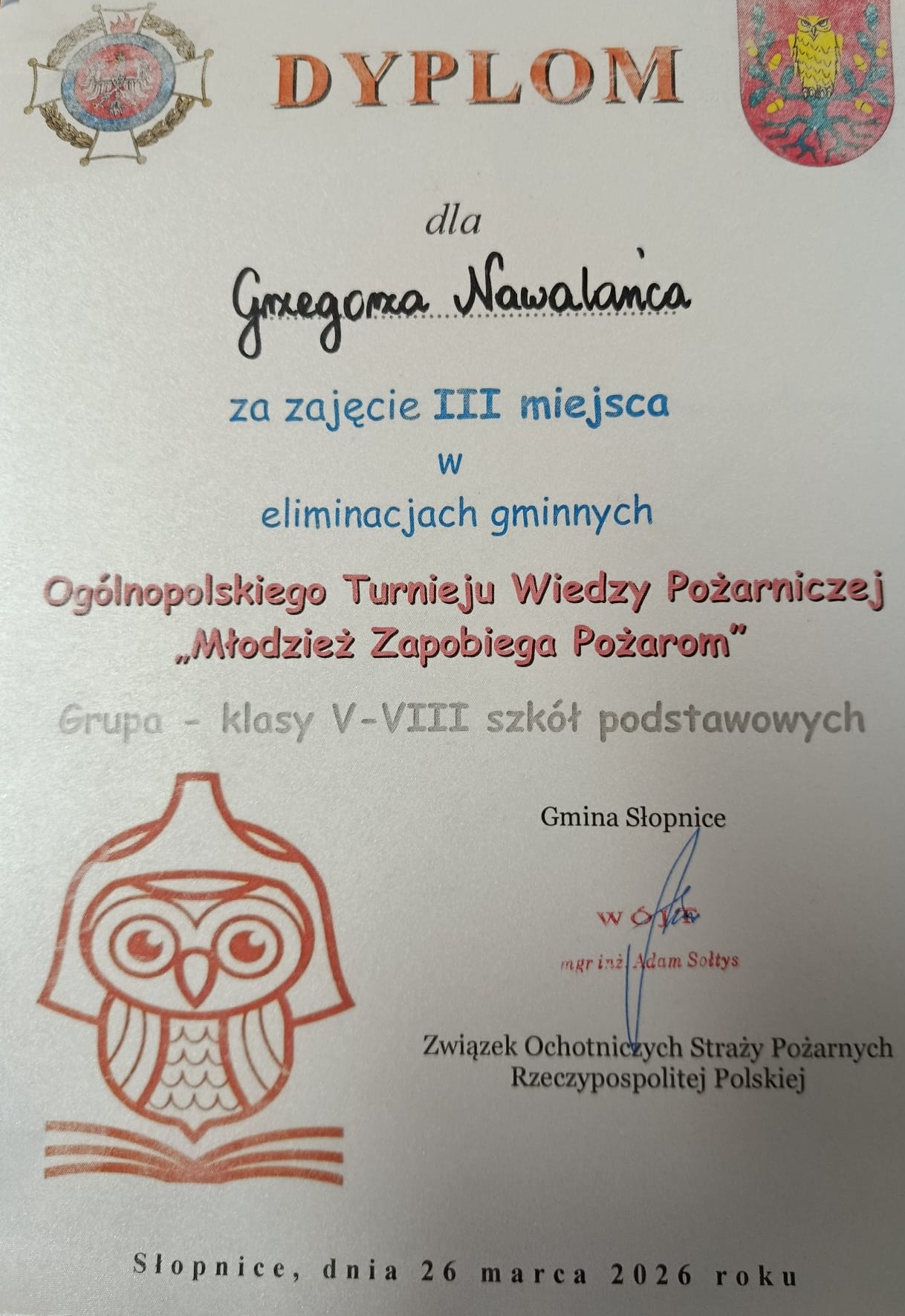 Sukces naszego ucznia w eliminacjach gminnych Ogólnopolskiego Turnieju Wiedzy Pożarniczej ,,Młodzież Zapobiega Pożarom"